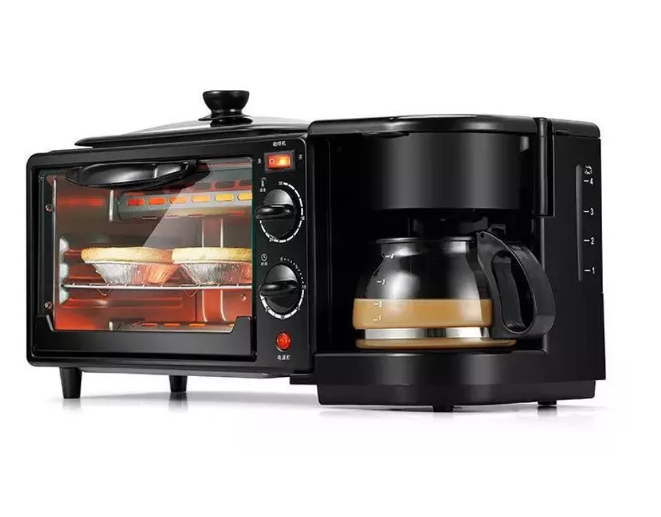 Máquina de Desayuno 3-en-1: Cafetera, sartén y Horno.
