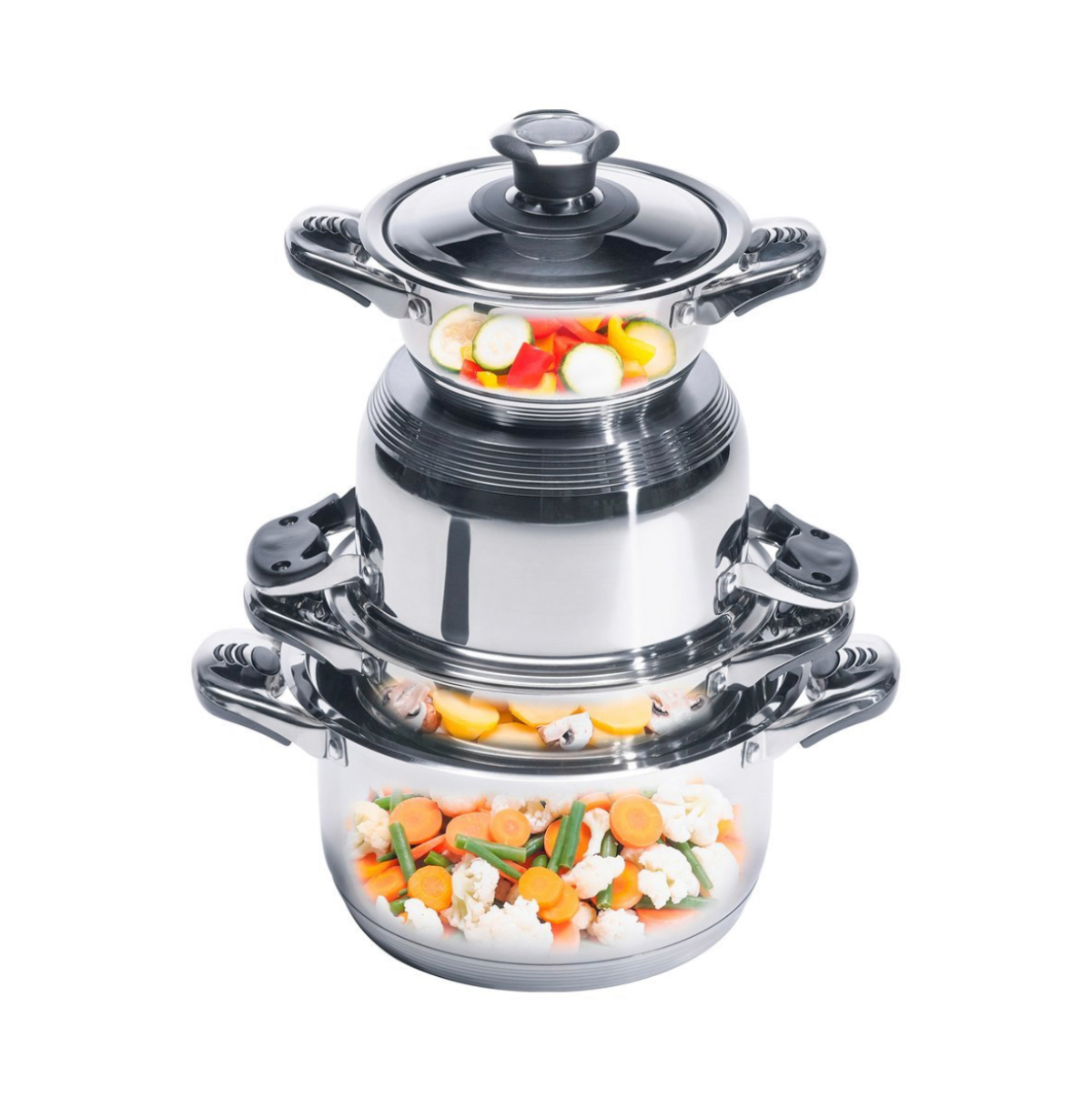 Todos nuestros utensilios son fabricados con once capas distintas de acero esto se hace así para que la temperatura pueda distribuirse de forma uniforme logrando de esta manera que los alimentos se cocinan rápidamente empleando menos aceite y también menos agua pero manteniendo su sabor